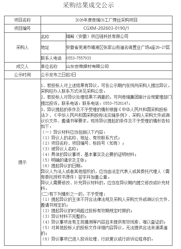 For complete details, please refer to the original procurement result announcement published by Chery: